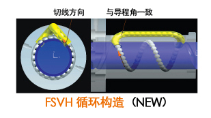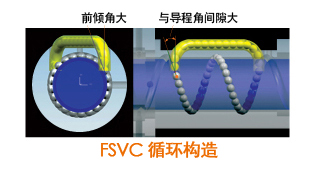 舊型式(FSVC)之循環(huán)方式為回流管垂直插入滾珠溝槽形成一前傾角,滾珠在進(jìn)入回流管時(shí)會(huì)與回流管撞擊而彈入回流管,F(xiàn)SVH系列之循環(huán)構(gòu)造由切線方向進(jìn)入回流管,與導(dǎo)程角方向一致可順暢進(jìn)入回流管,可提高循環(huán)構(gòu)造之使用壽命。
